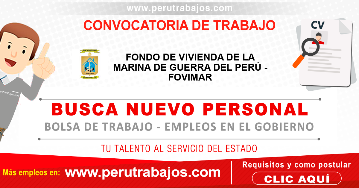 CÓMO POSTULAR: Presentación de Currículum Vitae la Solicitud de Participación y Declaración Jurada al correo electrónico: [email protected] con el siguiente asunto: ASUNTO: (Apellidos y Nombres) PROCESO CAS N° ___ - 202__- CASFOVIMAR (Se recepcionará desde las 08:30 hasta las 15:00 horas).