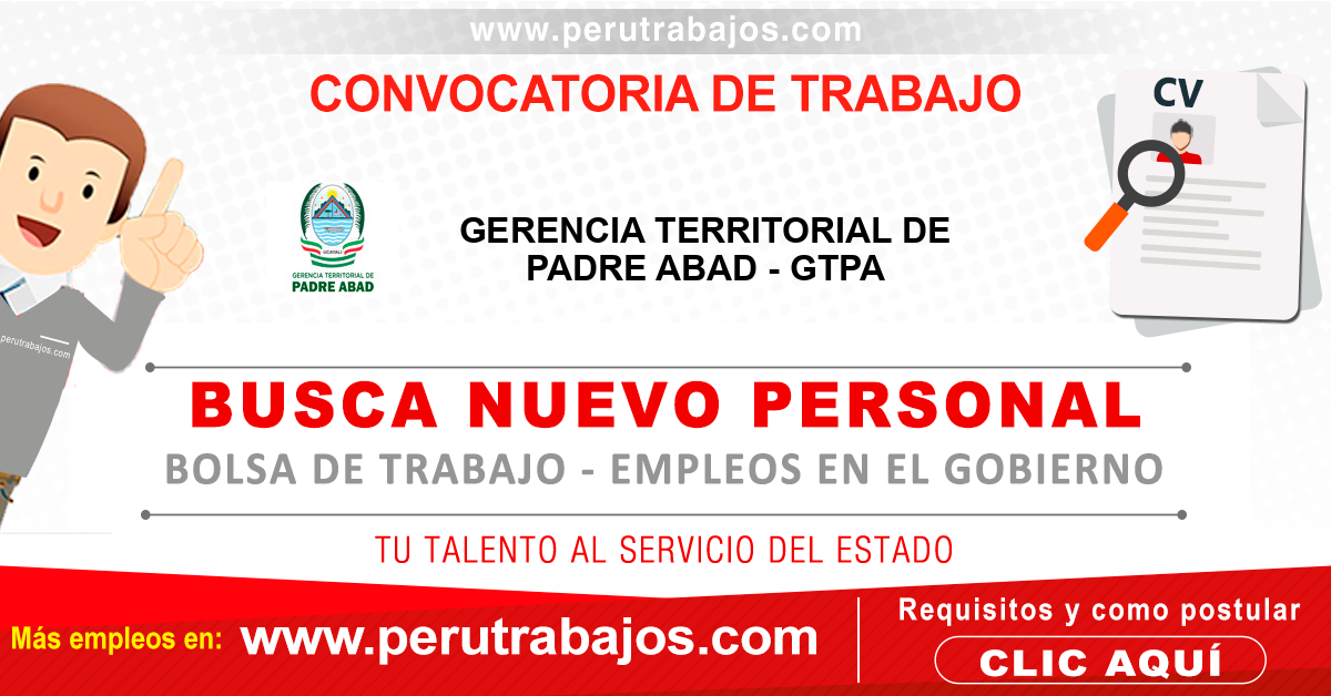 GTPA - GERENCIA TERRITORIAL DE PADRE ABAD requiere personal afines a las carreras de Computación e informática, Contabilidad, Ingeniería de sistemas.