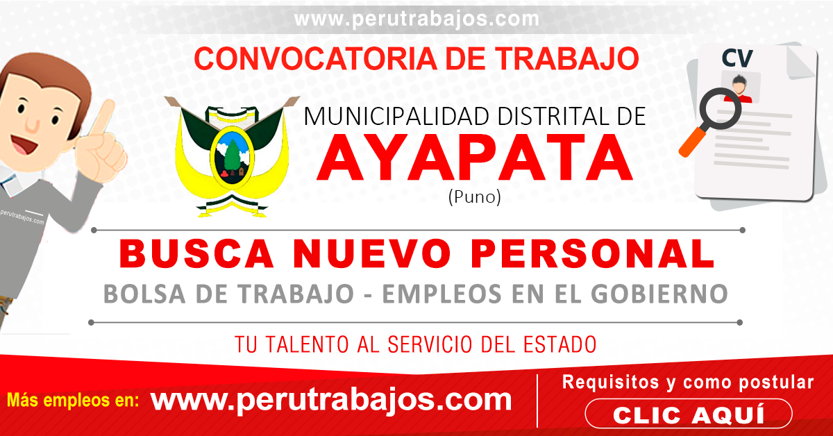 MUNICIPALIDAD DE AYAPATA requiere personal afines a las carreras de Antropología, Arquitectura, Derecho, Sociología, Ingeniería civil, Responsable de área técnica municipal, Responsable de la unidad de programa de vaso de leche, Asistente de oficina.