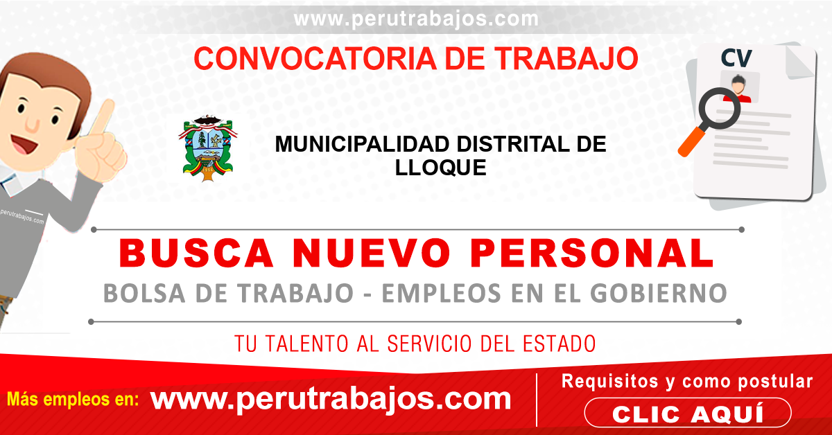 MUNICIPALIDAD DE LLOQUE requiere personal afines a las carreras de Jefe de area de tesorería, Jefe de la oficina de planeamiento y presupuesto, Jefe de la unidad de logística.