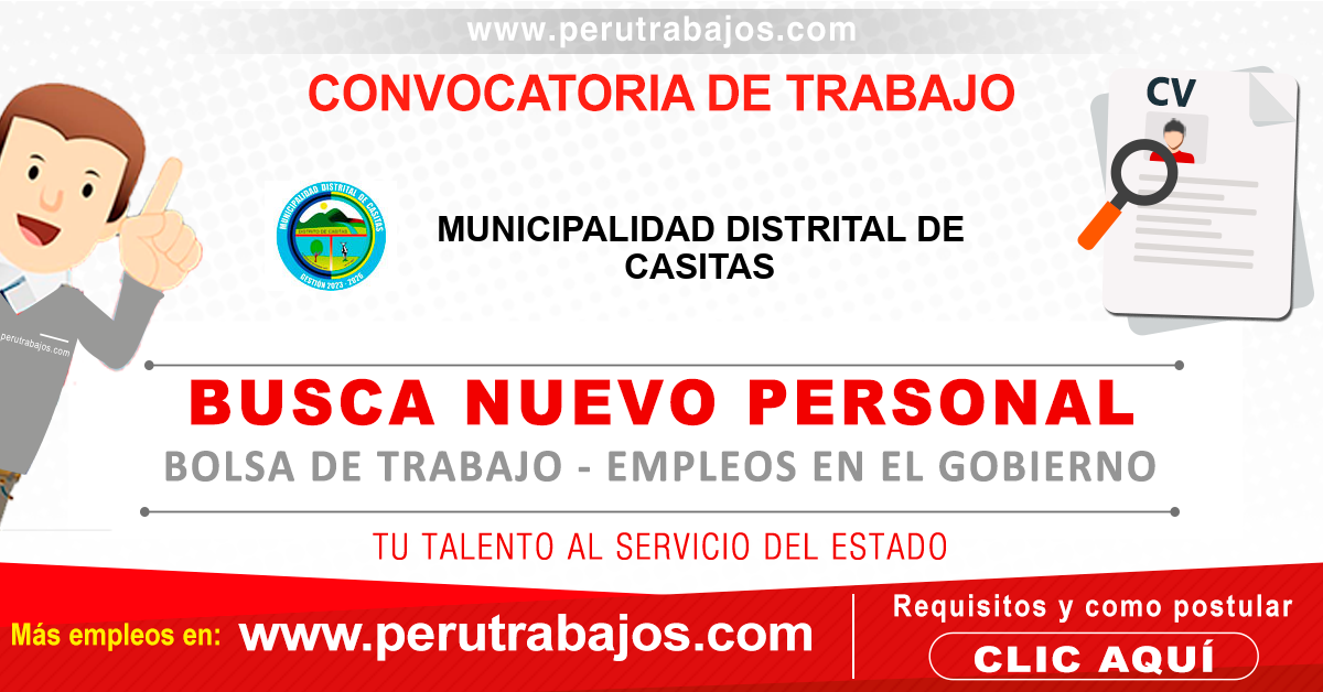 Aquí podrá revisar todas las convocatorias MUNICIPALIDAD DE CASITAS 2026 y su bolsa de trabajo actualizado con nuevas oportunidades laborales.