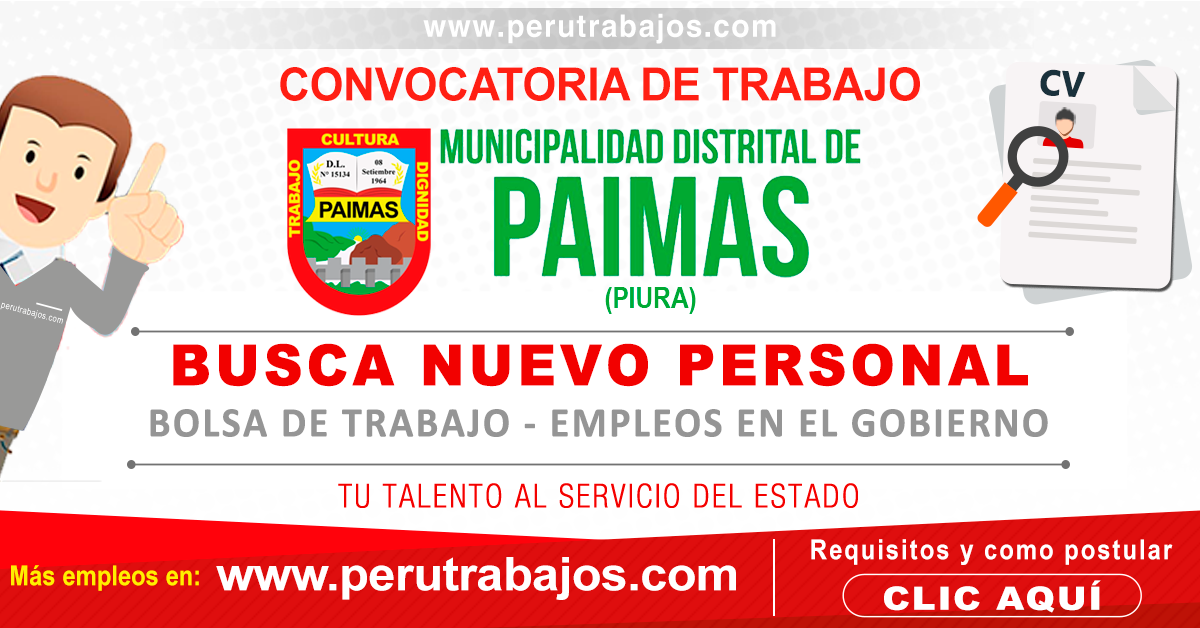Aquí podrá revisar todas las convocatorias MUNICIPALIDAD DE PAIMAS 2025 y su bolsa de trabajo actualizado con nuevas oportunidades laborales.