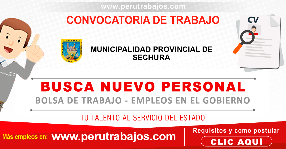 Aquí podrá revisar todas las convocatorias MUNICIPALIDAD DE SECHURA 2026 y su bolsa de trabajo actualizado con nuevas oportunidades laborales.